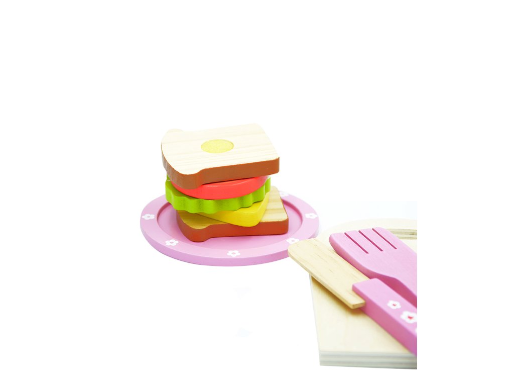 - Jednotlivé prvky dřevěné sady jsou opatřeny suchým zipem, díky kterému může vaše dítě vybrané části spojit do celku, např. sendvič (z kombinace prvků imitujících uzeniny, chléb).