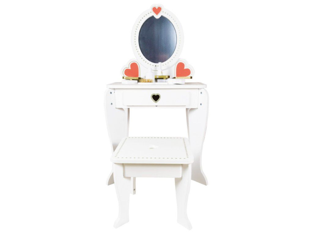 Toaletní stolek Ofélie není jen hračka, ale také elegantní dekorativní prvek do dětského pokoje. Díky jemnému zdobení ve tvaru srdce a sofistikovanému designu vnese do interiéru zvláštní kouzlo.