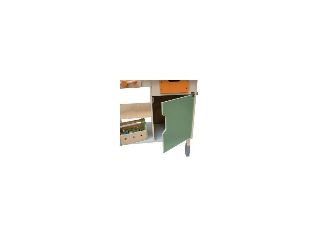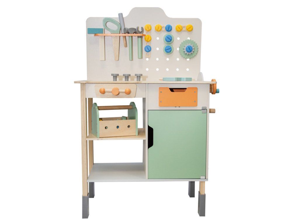Dílna je vyrobena z hladkého MDF dřeva, malovaného netoxickými barvami splňujícími normy EN71. Každý prvek je navržen tak, aby byl bezpečný i pro malé dětské ručky – zaoblené hrany, stabilní konstrukce a pevné uchycení dílů zaručují dlouhou a radostnou hru.