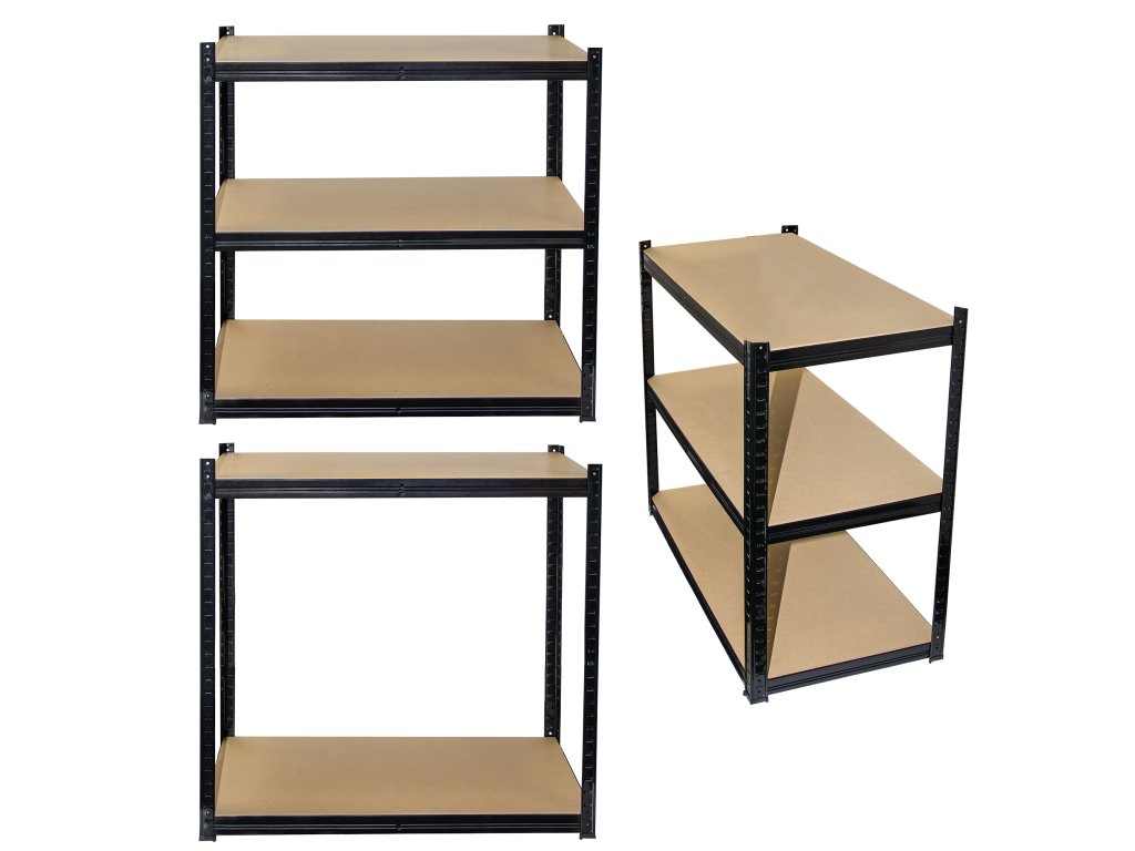 Každá varianta má pozinkovaný rám s černou povrchovou úpravou, MDF police a nosnost až 150 kg na polici.