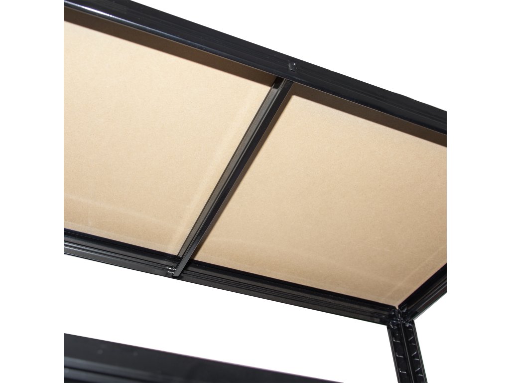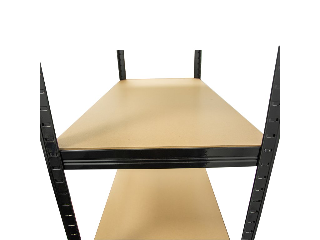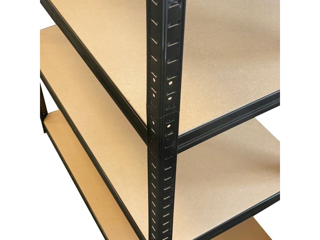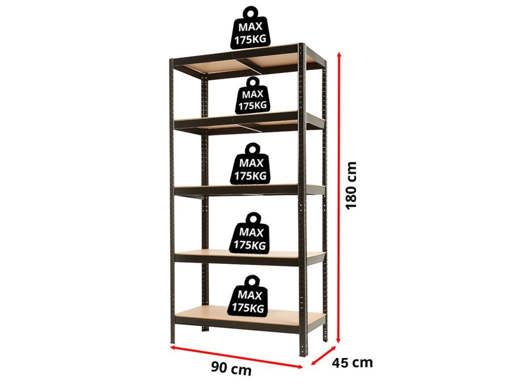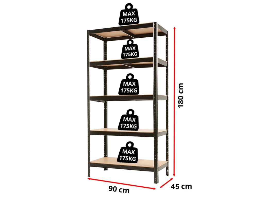 Regál nabízí 5 pevných polic z MDF desky (5 mm), které unesou až 150 kg na polici, tedy celkem 750 kg. Díky rozměrům 180×90×40 cm poskytuje dostatek úložného prostoru i pro těžší vybavení, aniž by působil masivně.