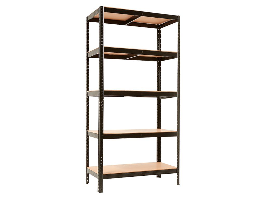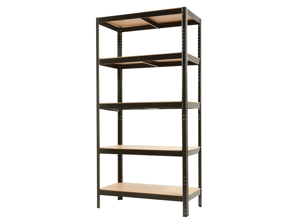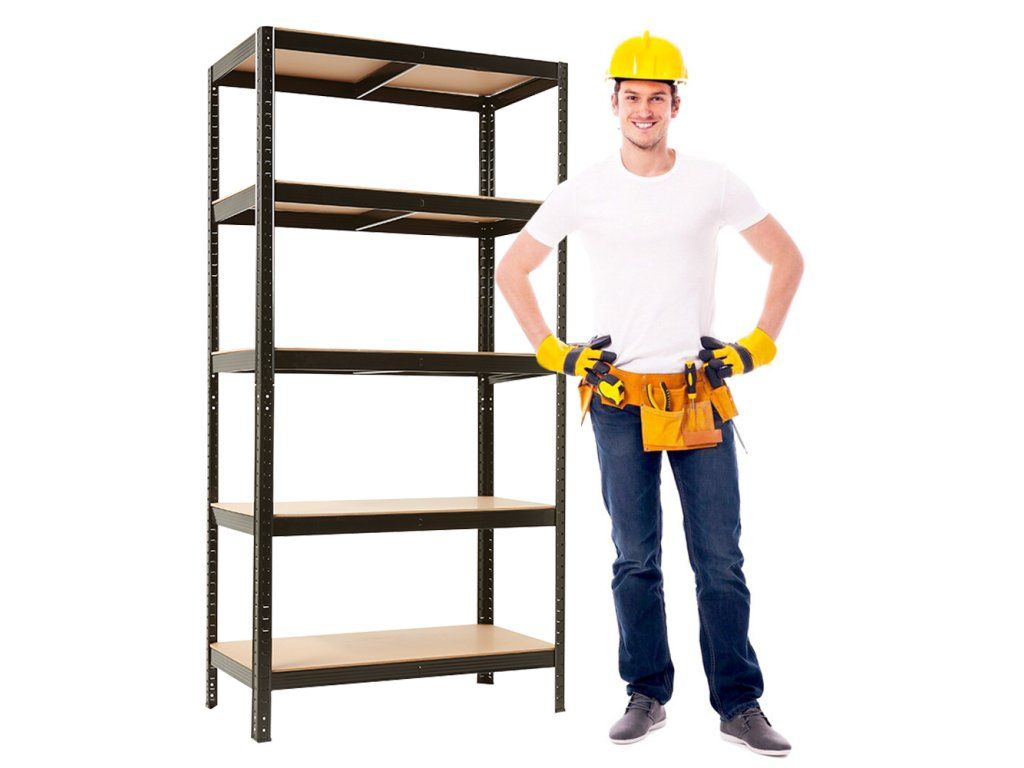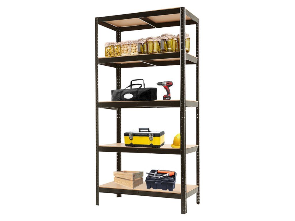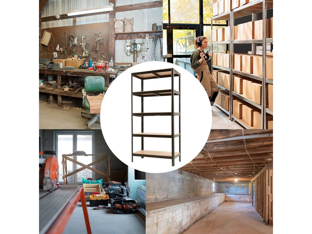 Regál nabízí 5 pevných polic z MDF desky (5 mm), které unesou až 150 kg na polici, tedy celkem 750 kg. Díky rozměrům 180×90×40 cm poskytuje dostatek úložného prostoru i pro těžší vybavení, aniž by působil masivně.