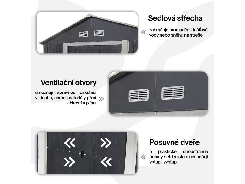 Díky prostornému interiéru můžete snadno uspořádat všechny své nástroje a vybavení. Ochrání vaše věci před nepříznivým počasím a prodlouží jejich životnost.